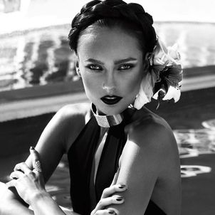 Supermodel Karmen Pedaru posing for Vogue Germany's latest cover story photographed by magazine's regular Alexi Lubomirski.