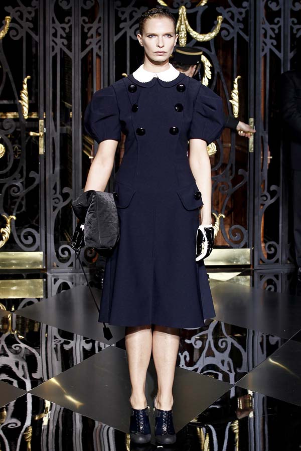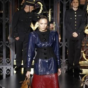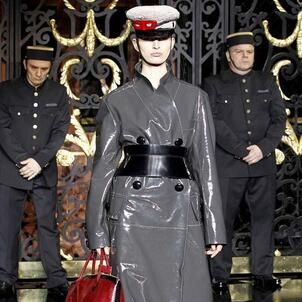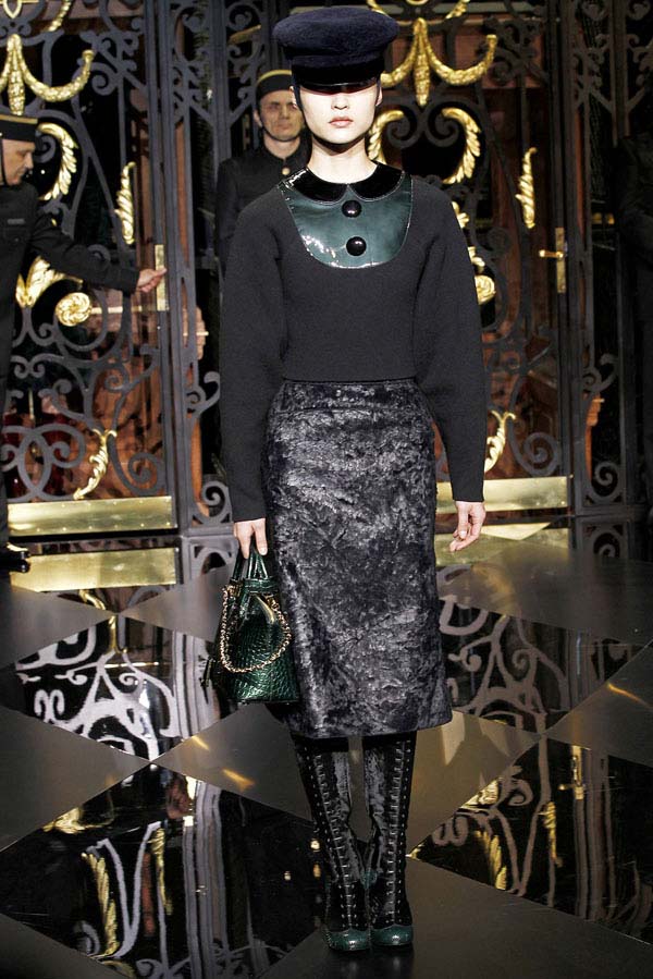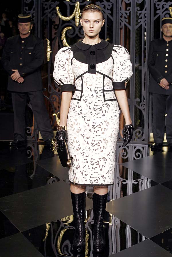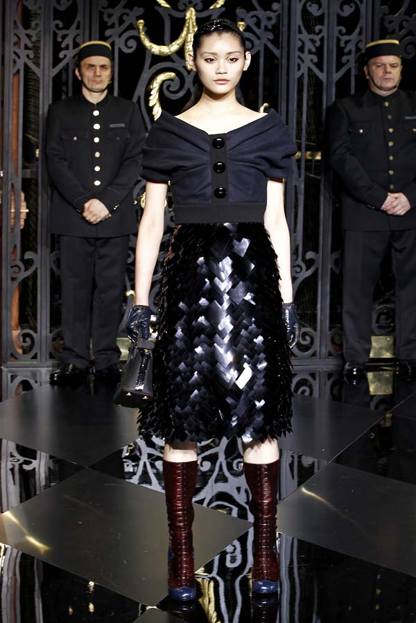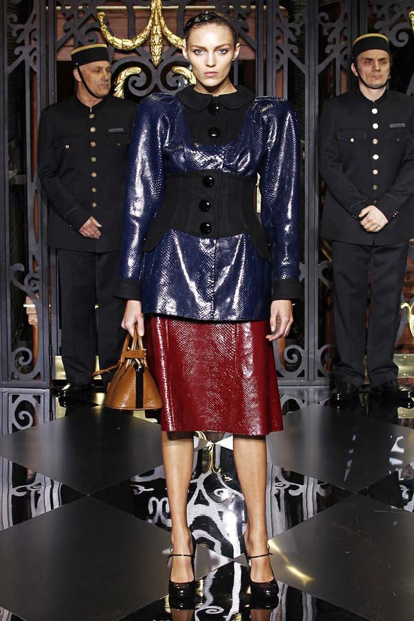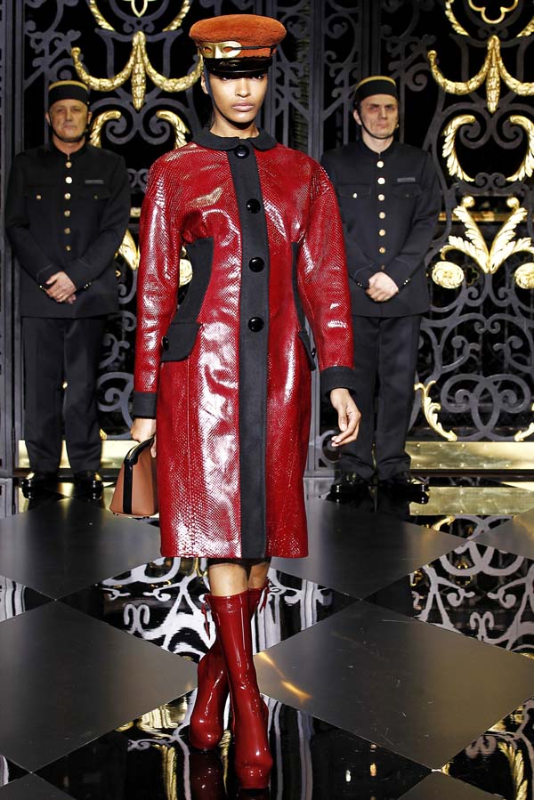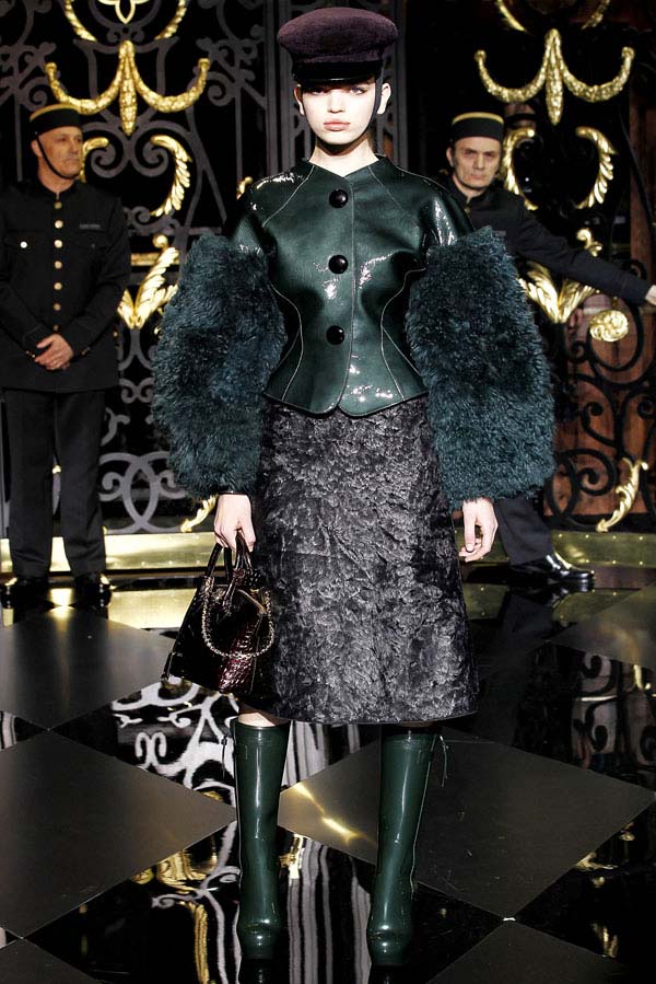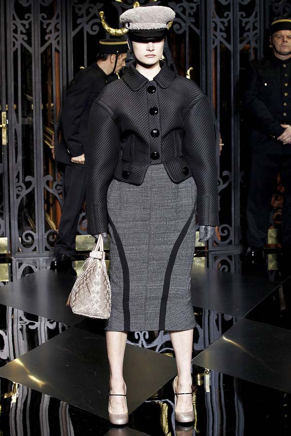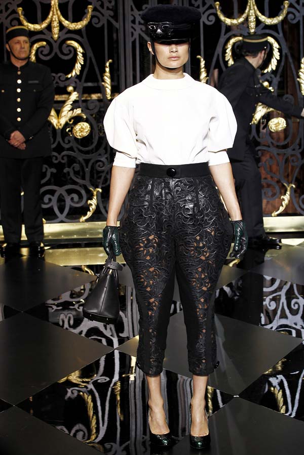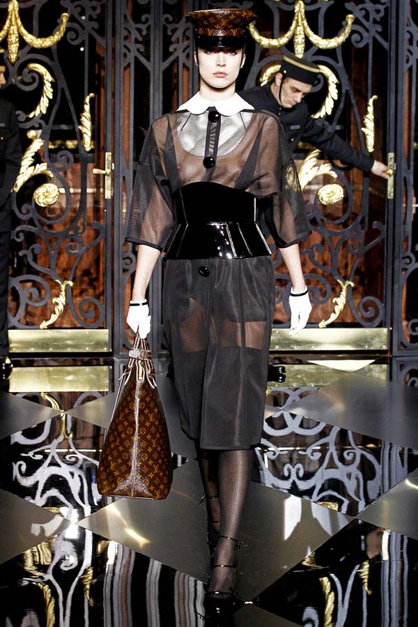 On the final day of Paris Fashion Week, Louis Vuitton show opened with fetish-inspired collection as the models stepped out of three elevators onto the catwalk. Creative director Marc Jacobs send models including Freja, Shu Pei and Kinga strutting the stuff on runway donning handcuffs, pantless outfits, leather pieces, lace and lovely sheer and masks placed on chauffeur hats.