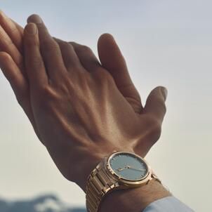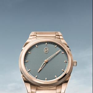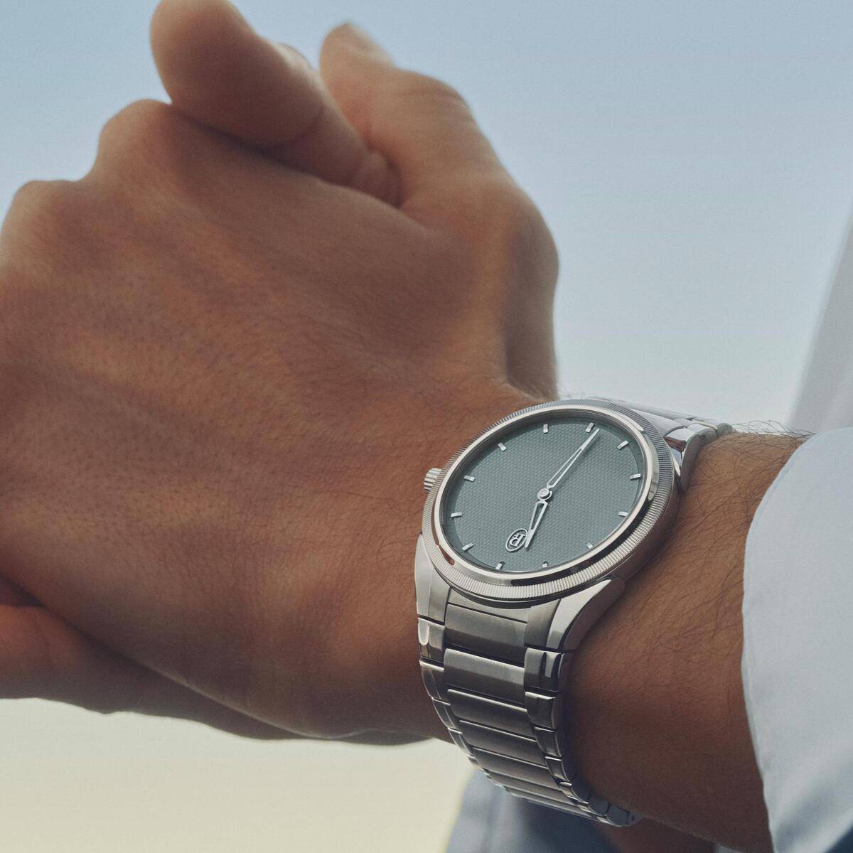 The collection offers two distinct material expressions of this new palette, each maintaining a rigorous design harmony. In polished and satin-finished stainless steel, the watch is a vision of contemporary purity, featuring a knurled bezel crafted from precious platinum 950. For those seeking a deeper sense of warmth, the 18-carat rose gold edition introduces a rich tactility that beautifully offsets the hand-guilloché dial.
