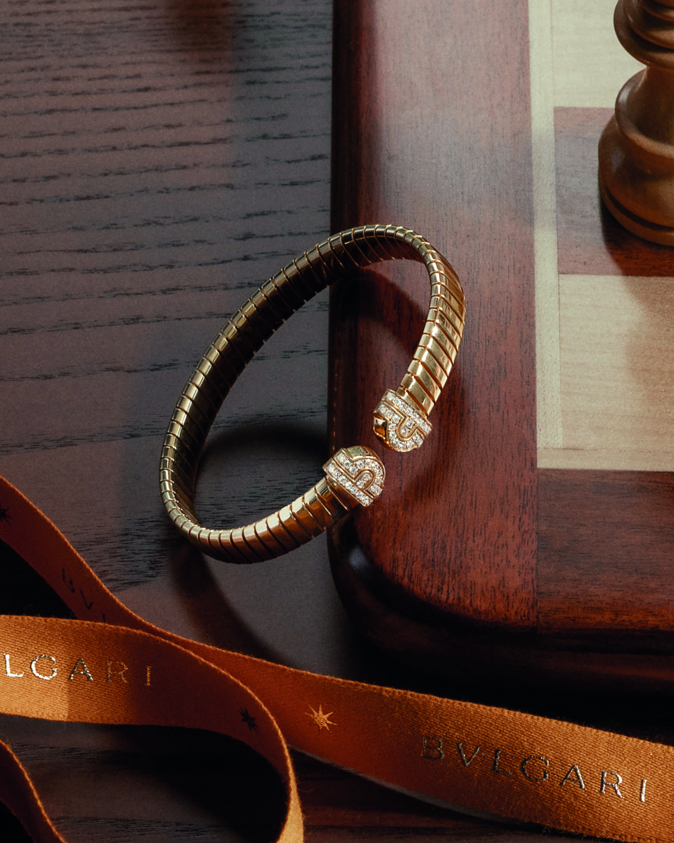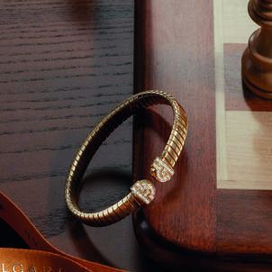 The Bvlgari Tubogas universe expands with a sculptural new ring featuring a rounded profile enriched with diamond pavé. The collection's distinctive flexible aesthetic returns in two classic bracelets in yellow gold, one punctuated by diamond studs and the other adorned with Parentesi elements drawn from the Maison's rich archives. Mastery of innovation rooted in heritage remains the guiding thread through these sculptural gold creations.