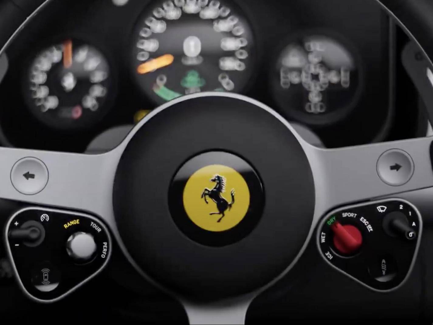 The four-door, four-seater grand tourer introduces a revolutionary gauge cluster screen composed of several physical layers. By meticulously cutting apertures into the upper tiers of the display, Ferrari has created a deep, three-dimensional environment for the driver. The speedometer graphic sits physically below the level of a traditional needle, which is itself positioned behind additional drive information and beneath a curved inset lens.