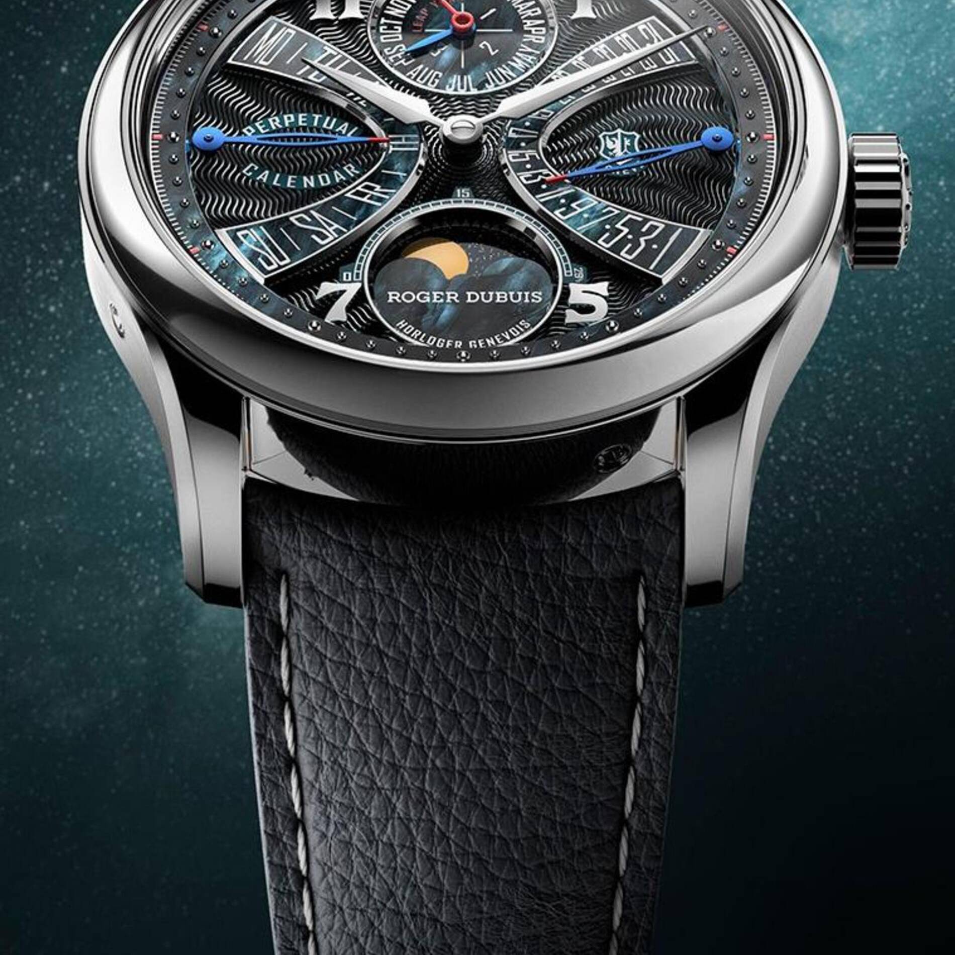 Presented in a refined 38 mm silhouette of 18K pink gold, this anniversary edition is limited to a mere 28 pieces, ensuring its status as a true collector's rarity. The timepiece embodies the complication most beloved by Mr. Roger Dubuis himself: the Perpetual Calendar, featuring the signature biretrograde display that he co-patented in 1989.